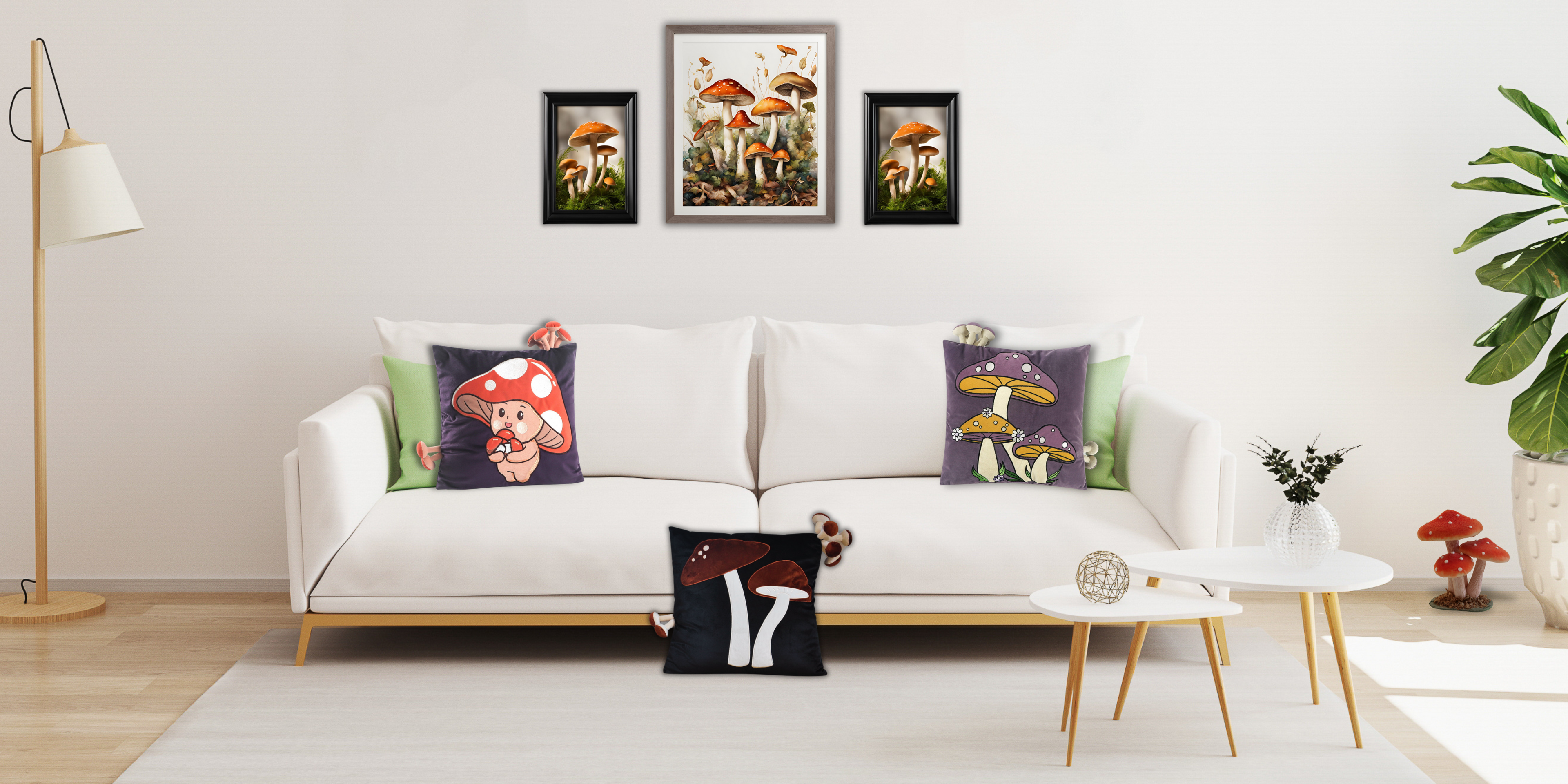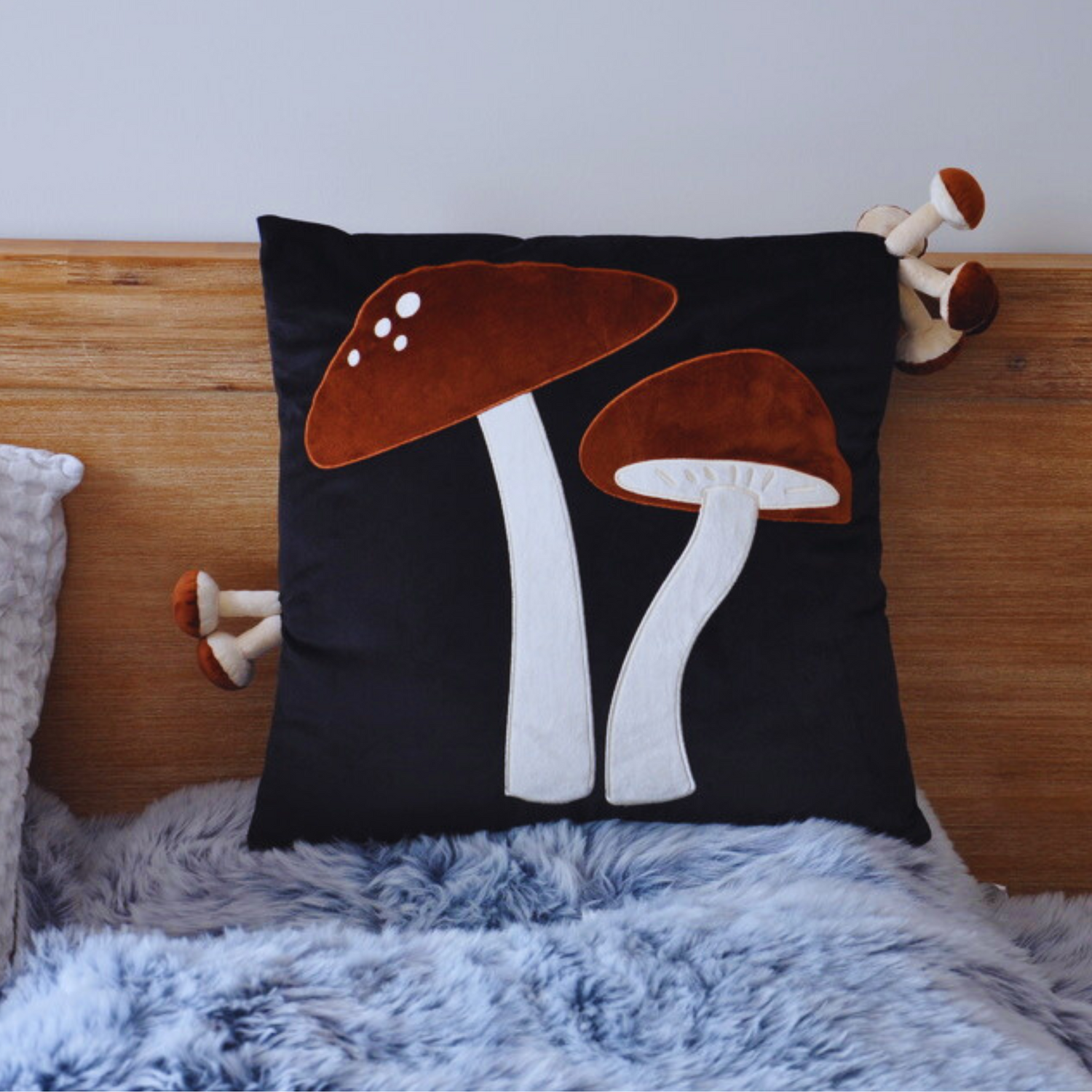 Elevate your living space with the enchanting Mebellezza Decorative Black Mushroom Throw Pillow Cover. Crafted with luxurious polyester velvet, this unique design features seven small plush mushrooms and two embroidered mushroom figures, creating a cozy and whimsical atmosphere.